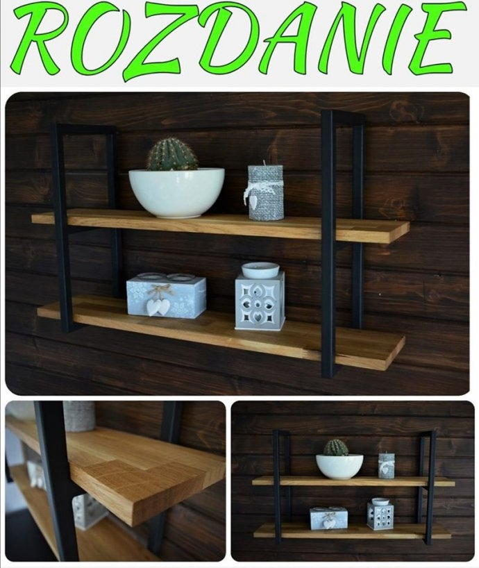 Półka ścienna industrialna wykonana ręcznie ze stali i drewna dębowego olejowanego naturalnym olejem uwydatniającym słoje drewna. Mocowanie za pomocą dwóch niewidocznych kołków z haczykami.
