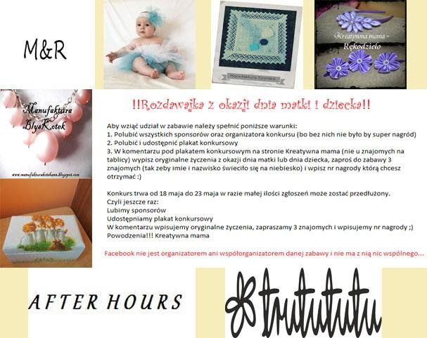 - W komentarzu pod plakatem konkursowym na stronie Kreatywnej mamy (nie u znajomych na tablicy) wypisz oryginalne życzenia z okazji dnia matki lub dnia dziecka, zaproś do zabawy 3 znajomych (tak zeby imie i nazwisko bylo podlinkowane, czyt. mialo kolor niebieski), wpisz nr nagrody którą chcesz wygrać