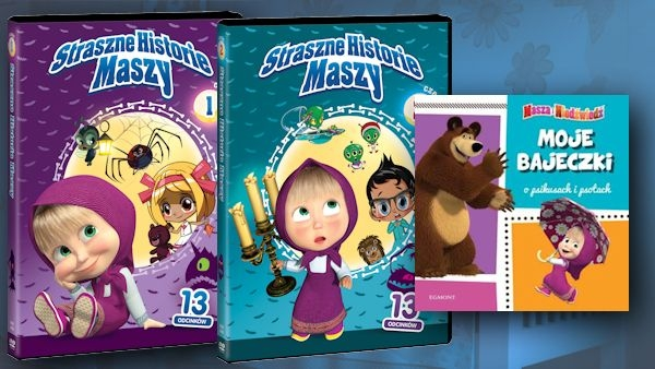 2 zestawy DVD "Straszne historie Maszy. Cz. 1 i 2" oraz książkę "Moje bajeczki. O psikusach i psotach"