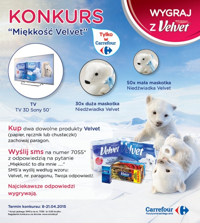 Aby wziąć udział w konkusie należy dokonać jednorazowego zakupu co najmniej 2 dowolnie wybranych produktów marki Velvet, dokonany w sklepie konkursowym w okresie od dnia 08.04.2015 r. do dnia 21.04.2015 r. i udokumentowany jednym dowodem zakupu;