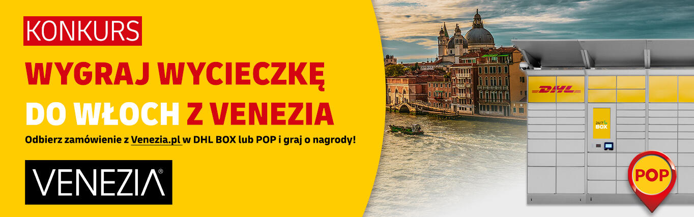 - Zrób zakupy na Venezia.pl w dniach 27.02 - 15.03.2026 r. wybierając dostawę do automatu DHL BOX lub punktu DHL POP.