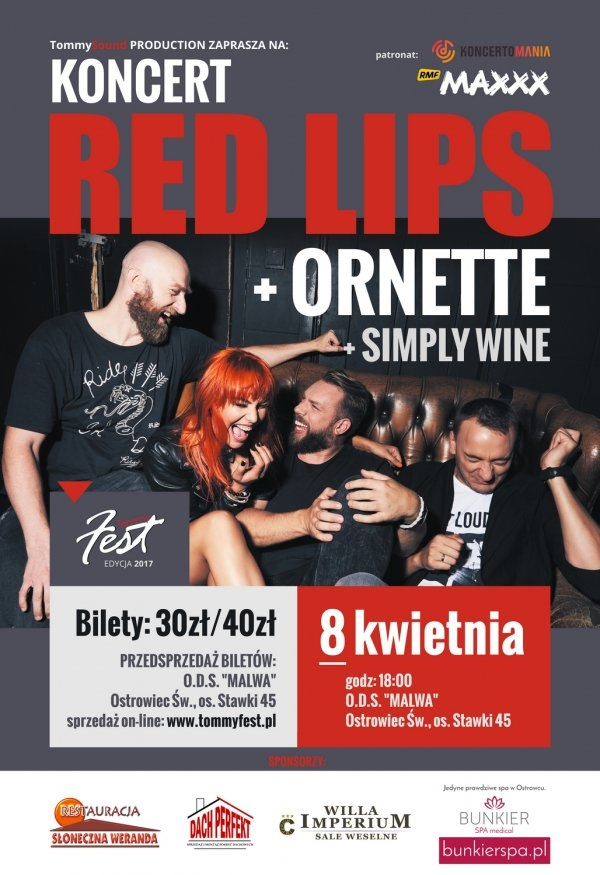 4 podwójne zaproszenia na koncert TommyFest 2017: Red Lips, Ornette i Simply Wine, który odbędzie się 8.04.2017 w Ostrowcu Świętokrzyskim - Malwa.