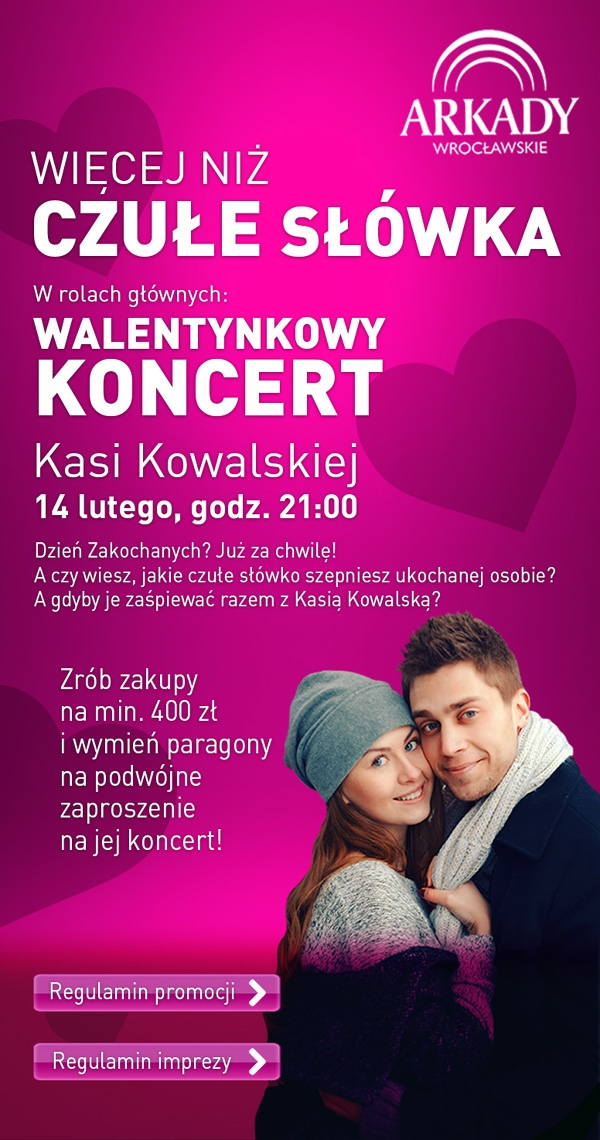 zaproszenie dla dwóch osób do uczestnictwa w Koncercie Walentynkowym, który odbędzie się w dniu 14 lutego 2016 o godz. 21:00, na poziomie 0 w Centrum Handlowym Arkady Wrocławskie.