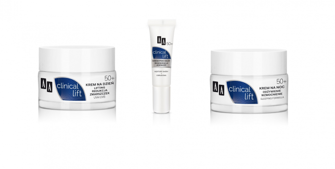 4 zestawy kosmetyków AA Clinical Lift (AA Clinical Lift 50+ Krem na dzień lifting + redukcja zmarszczek + AA Clinical Lift 50+ Krem na noc odżywienie + wzmocnienie + AA Clinical Lift 50+ Krem pod oczy regeneracja + jędrność)