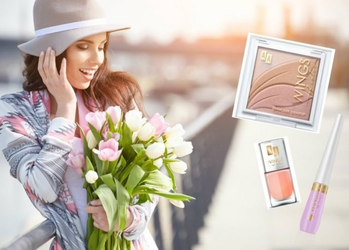 7x zestaw kosmetyków do makijażu AA Wings of Color, w którego skład wchodzi: tusz do rzęs, lakier do paznokci, pomadka i rozświetlacz.