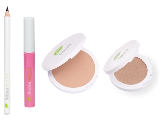 zestaw kosmetyków naturalnych od marki felicea. W zestawie znajdziecie: naturalną kredkę do oczu, naturalny błyszczyk do ust, naturalny puder oraz naturalny cień do powiek.