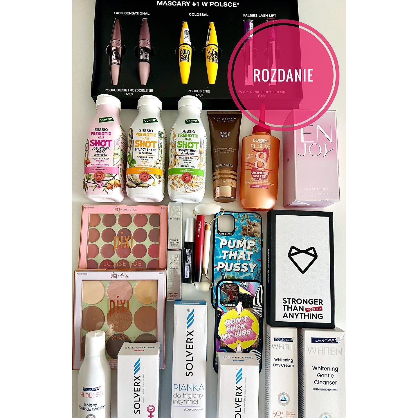 Maybelline mascary do rzęs, Sessio jogurtowa maska, 2 myjące shake do włosów, Vita Liberata samoopalacz, 2 paletki Pixi rozświetlacze i konturówki, szminki Irena Eris, Maybelline brow, czerwona pomadka, Mobile Fox case na telefon, Loreal odżywka do włosów - Drugie miejsce: