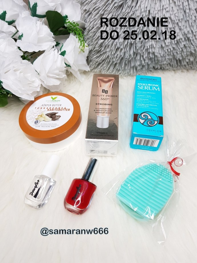 Masło do ciała CosNature, baza rozświetlająca AA, serum z kwasem hialuronowym GlySkinCare, top i lakier do paznokci Douglas oraz jajeczko do czyszczenia pędzli.