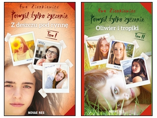 zestaw książek "Pomyśl tylko życzenie. Tom I. Z deszczu pod rynnę" i "Pomyśl tylko życzenie. Tom II. Oliwier i tropiki" Ewy Zienkiewicz.