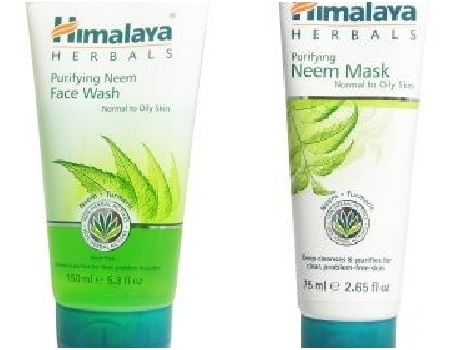4 zestawy kosmetyków, każdy składający się z żelu i maseczki z serii neem marki Himalaya Herbals.
