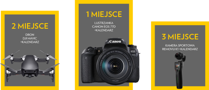 - Nagrody Główne za zajęcie miejsc od IV do XII w całym Konkursie – zestaw w skład którego wchodzą: kalendarz z dwunastoma Zdjęciami o wartości 50,00 (pięćdziesiąt złotych 00/100) PLN brutto oraz Gimbal ręczny DJI Osmo Mobile 2 o wartości 619,00 (sześćset dziewiętnaście złotych 00/100) PLN brutto, łączna wartość zestawu wynosi 669,00 zł