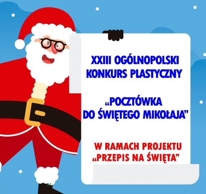 Zapraszamy do udziału w XXII edycji Ogólnopolskiego Konkursu Plastycznego „Pocztówka do Świętego Mikołaja”. Konkurs odbywa się w sześciu kategoriach wiekowych od 3 do 100 lat. Warto już dziś przygotować kartkę do Mikołaja.