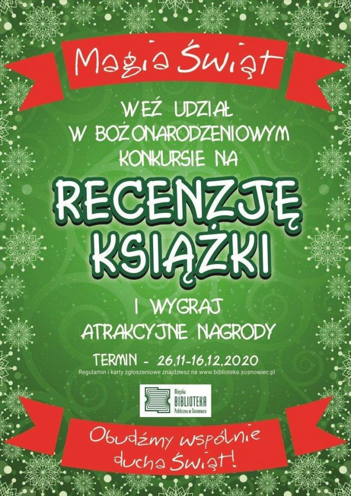 Miejska Biblioteka Publiczna w Sosnowcu serdecznie zaprasza do udziału w konkursie na recenzje książek o Bożym Narodzeniu lub takich, które bezsprzecznie ze Świętami się kojarzą, czyniąc z grudniowej celebracji istotny motyw fabularny.