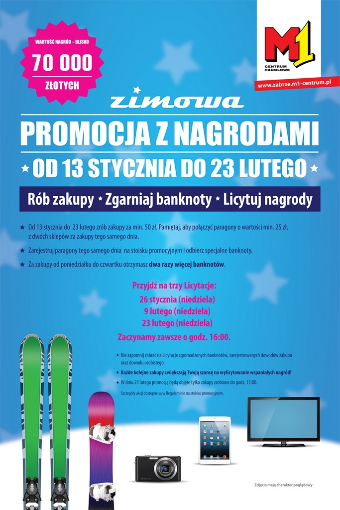 Zrobić zakupy w minimum dwóch sklepach na łączną wartość 50 złotych lub więcej w Centrum Handlowym M1 w Zabrzu;