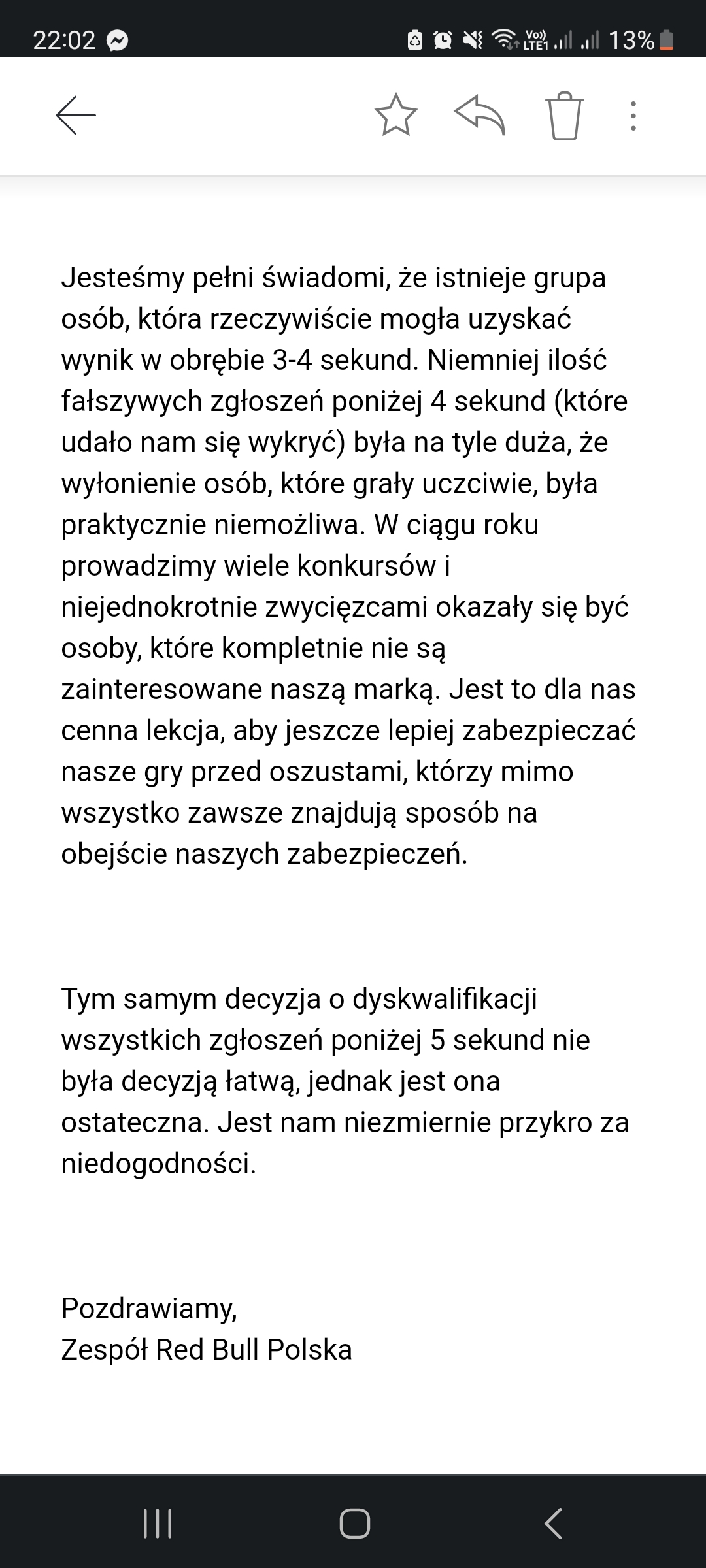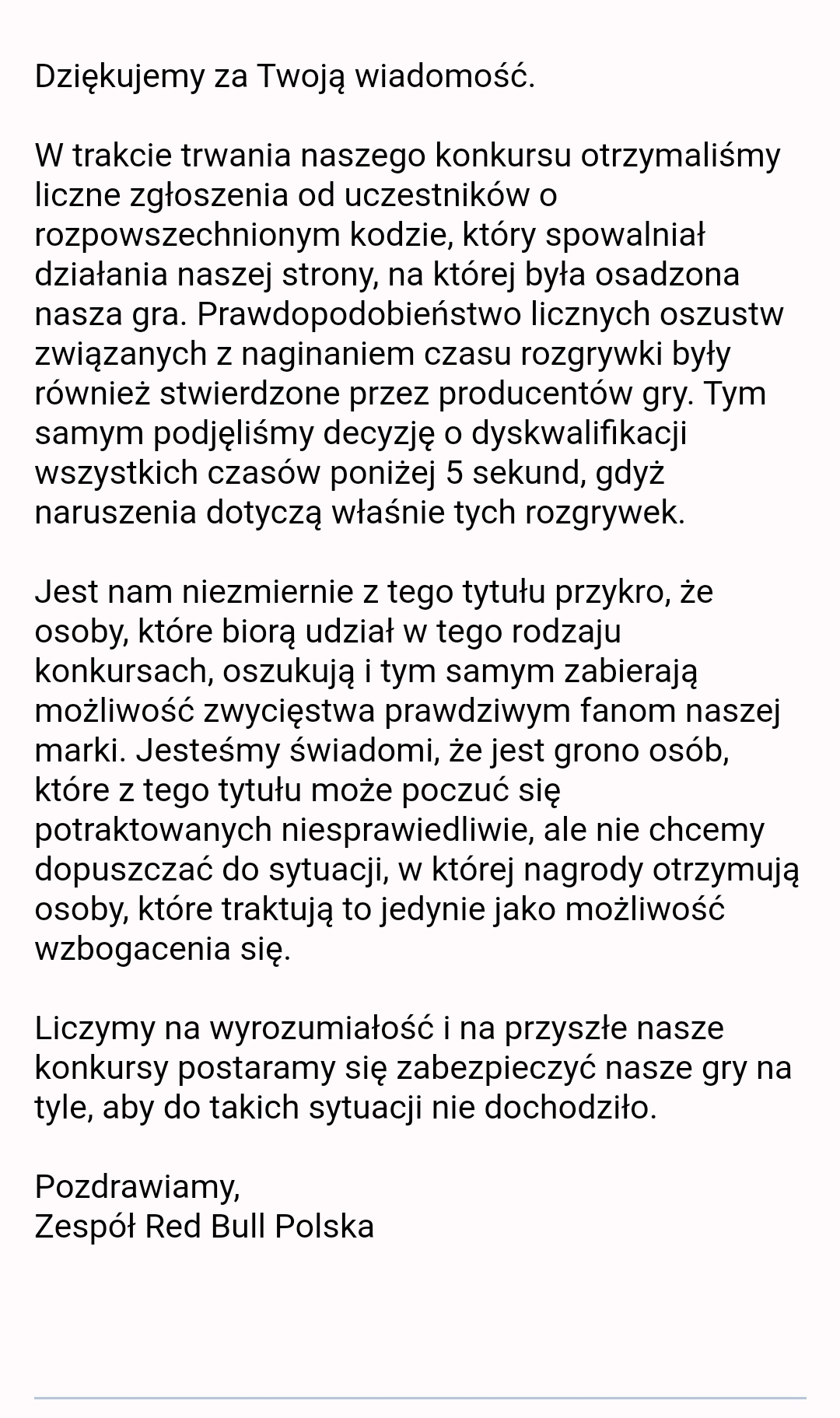 Tak jak część z was pisała w innych wątkach na tym forum - Redbull postanowił wybrać sobie komu wręczy nagrody w swoim konkursie, łamiąc w ten sposób jego regulamin. Pojawiły się wpisy nagrodzonych głośnikiem osób, które miały wynik 5 sekund, tymczasem sporo innych graczy miało lepsze wyniki (w tym ja).