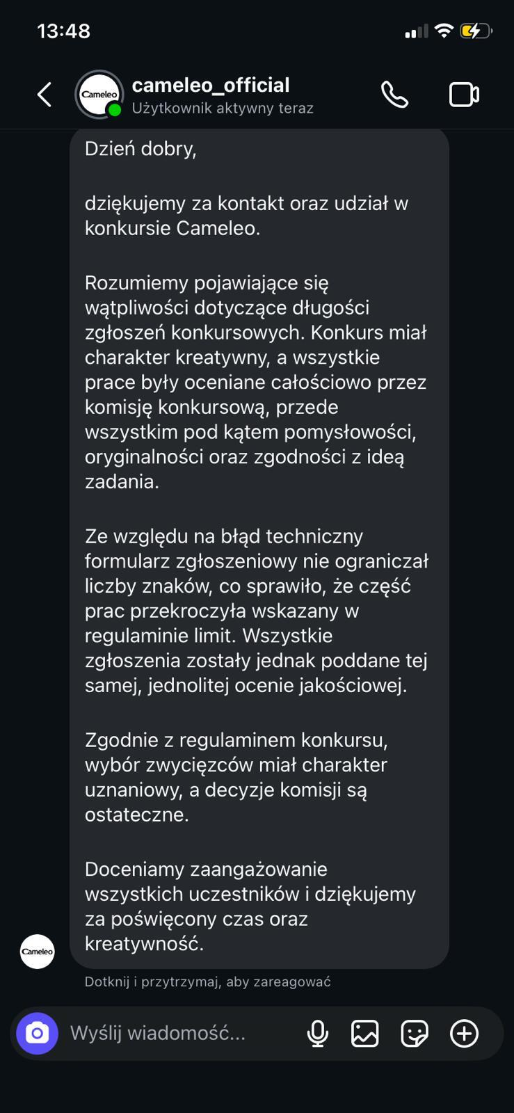 Szanowni Państwo,w odpowiedzi na Państwa wiadomość stanowczo odrzucam przedstawioną argumentację. Tłumaczenie się "błędem technicznym formularza" oraz "całościową oceną" jest nieakceptowalne i nie ma żadnego umocowania w powszechnie obowiązujących przepisach prawa.Regulamin konkursu stanowi przyrzeczenie publiczne (art. 919 i nast. Kodeksu cywilnego). Organizator jest bezwzględnie związany warunkami, które sam określił. Limit znaków (350) był twardym wymogiem formalnym. Prace, które nie spełniają wymogów formalnych regulaminu, podlegają odrzuceniu i nie mogą być w ogóle dopuszczone do oceny merytorycznej pod kątem "kreatywności" czy "pomysłowości".Zapis o tym, że "decyzje komisji są ostateczne i uznaniowe", dotyczy wyłącznie subiektywnej oceny walorów artystycznych i kreatywnych tych prac, które spełniają wymogi formalne. Nie stanowi on dla Organizatora furtki do swobodnego łamania własnego regulaminu.Dopuszczenie do konkursu, a następnie nagrodzenie prac, które wielokrotnie przekroczyły narzucony limit (zwycięskie teksty mają od 600 do ponad 1200 znaków!), w rażący sposób narusza zasady uczciwej konkurencji. Uczestnicy, którzy zastosowali się do Państwa regulaminu mieli drastycznie ograniczone możliwości wykazania się kreatywnością w stosunku do osób, które zignorowały zasady. Błąd techniczny leżący po Państwa stronie nie usprawiedliwia dyskryminowania uczestników grających fair.W związku z powyższym wzywam Państwa do: