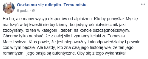 A ci inni ratują, bo rozumieją te marzenia i wiedzą doskonale, że dziś oni są ratownikami czyichś żyć i marzeń, ale za tydzień/rok/10lat ich położenie może zmienić się o 180stopni i to oni będą w potrzasku. Tak jak ktoś tu napisał, środowisko himalaistów jest specyficzne (wdg. mnie cudowne).