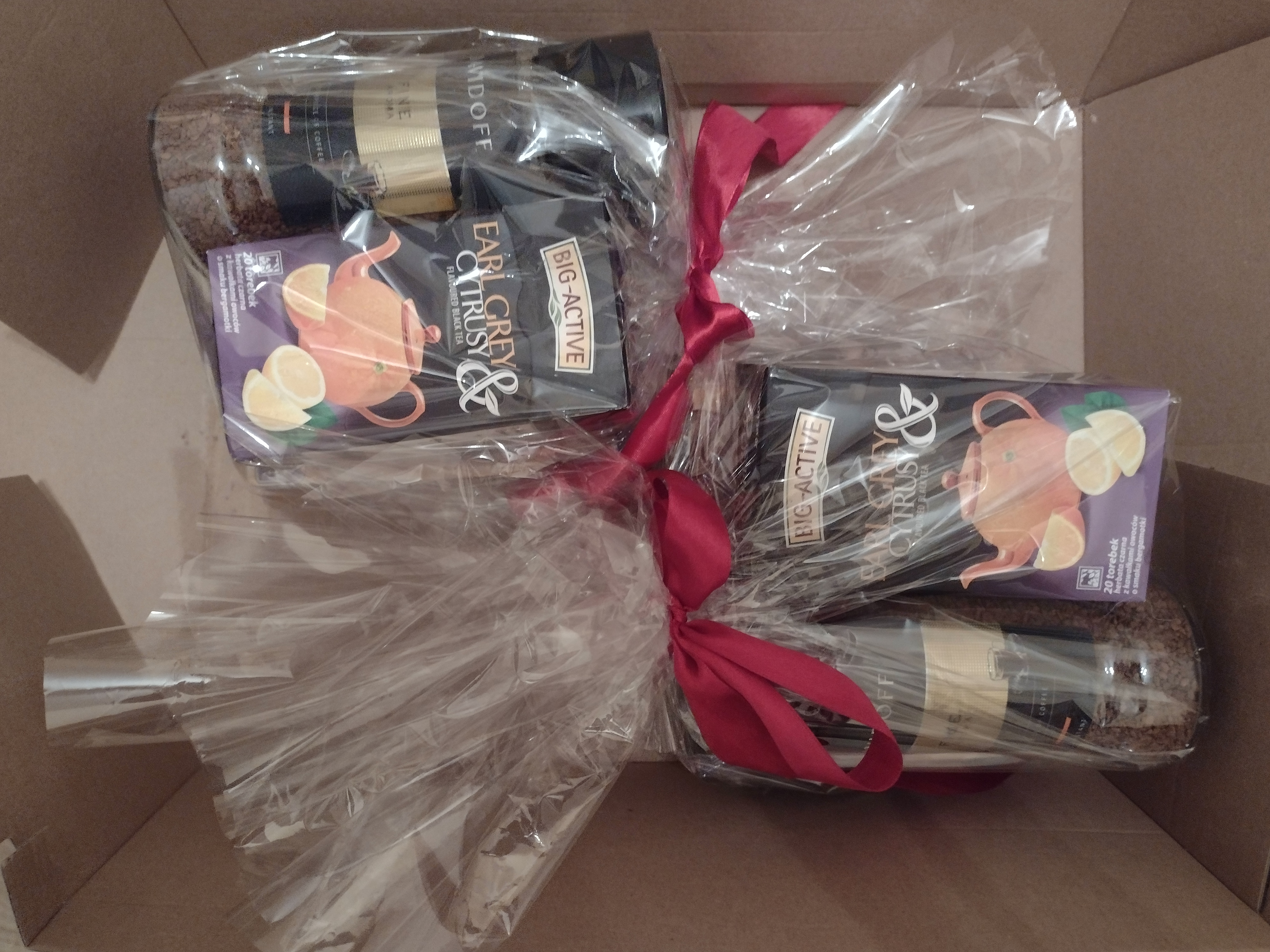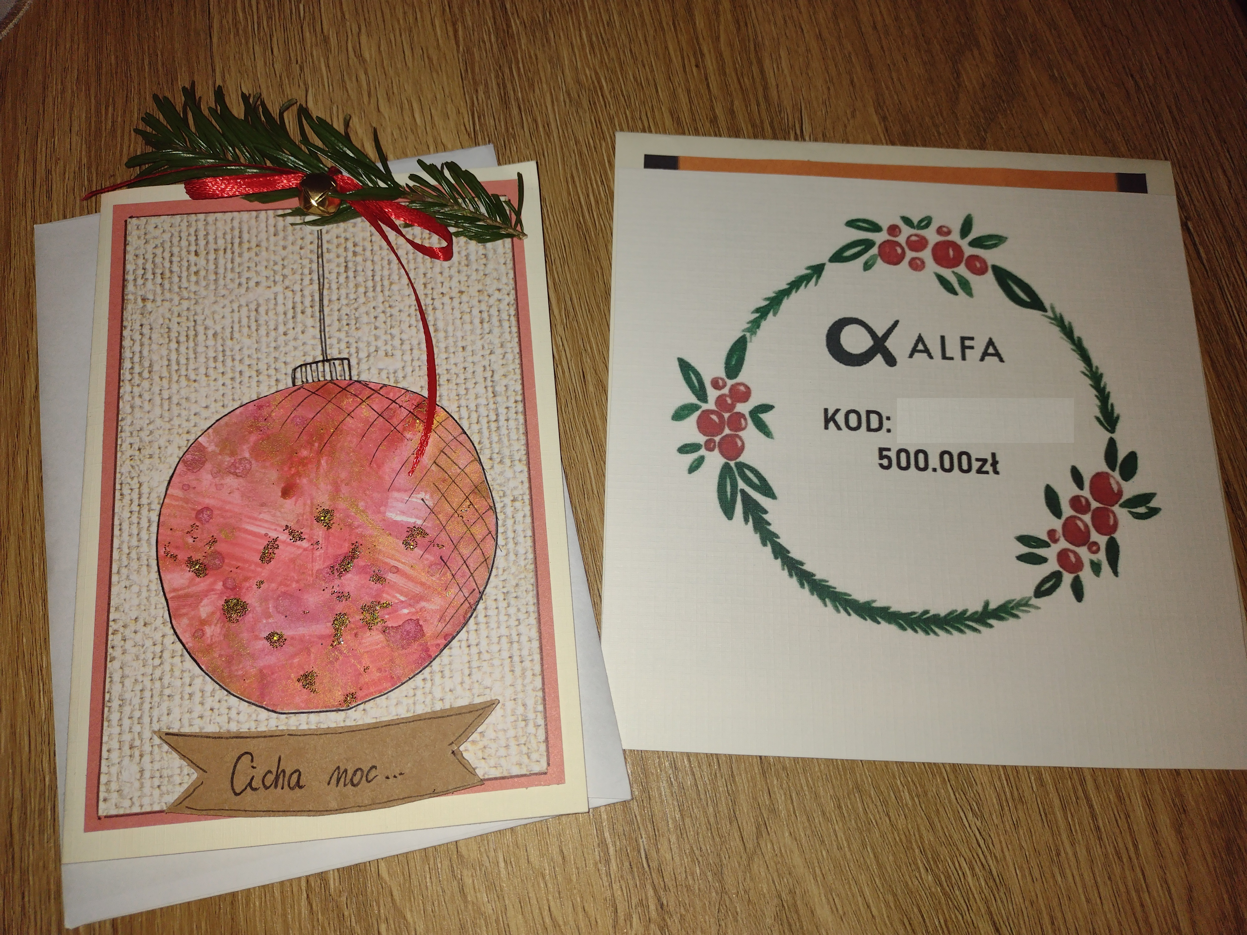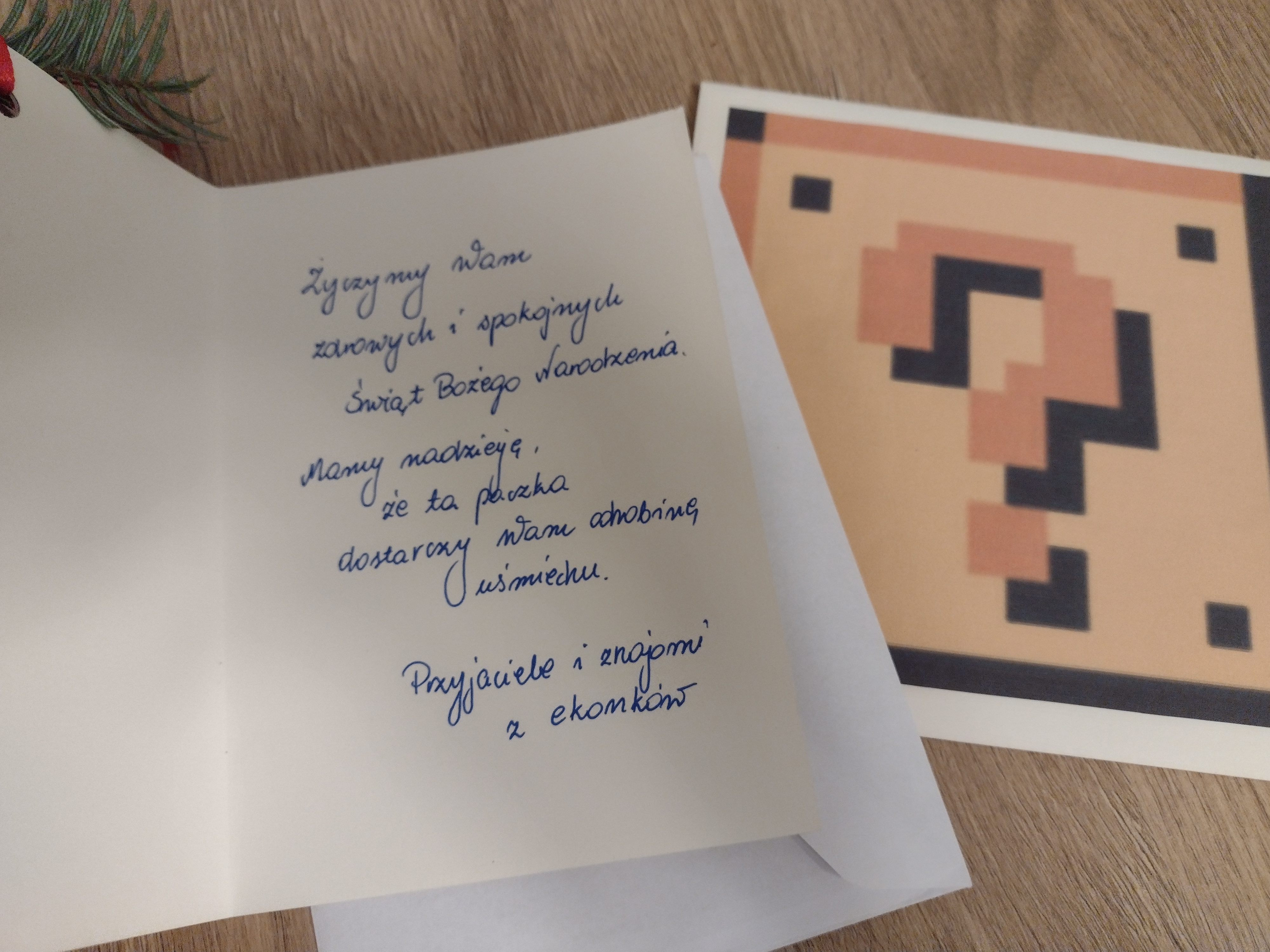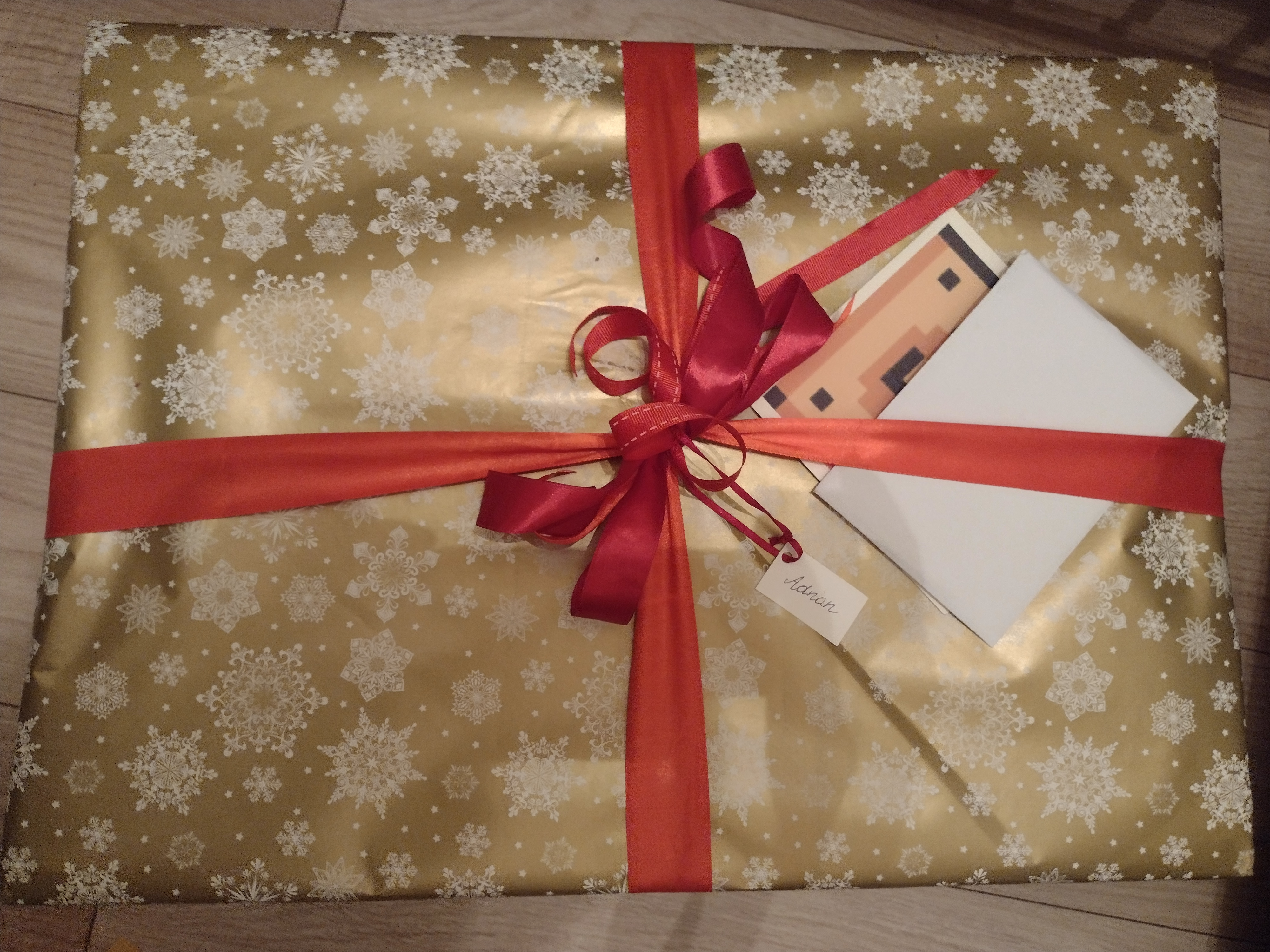 Były małe przeboje z kartą do Galerii, ale na szczęście wszystko się udało i paczka dotarła przed świętami do adresatów. Kartkę świąteczną zrobiła moja siostra. W kopercie ze znakiem zapytania z gry Mario był kartka z kodem do odbioru karty do Galerii, a z tyłu instrukcja odbioru karty. Prezent dla Adriana był zapakowany w ozdobny świąteczny papier, a upominki dla rodzeństwa w celofan ze wstążką. Paczka była naprawdę spora;)