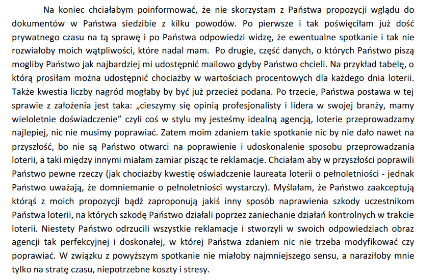 - nagrody (zgodnie z regulaminem) pozostają do dyspozycji organizatora (dlatego nie odpisali mi ile nagród wydali, bo wtedy wyszłoby, że w rzeczywistości wydali jakieś nieliczne nagrody, a większość nagród pozostała u nich)