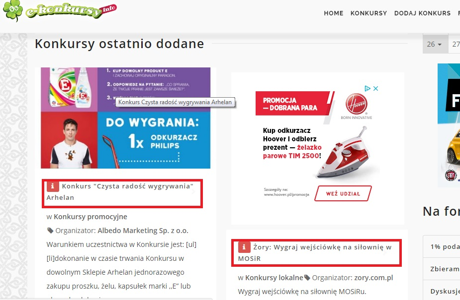 - Czy na stronie głównej w konkursach świeżo dodanych nie dałoby się tego kto dodał dać na dół? A na górze tylko kategoria konkursu i organizator? W tej chwili mam wrażenie, że tych informacji jest za dużo obok siebie i się razem trochę zlewają.