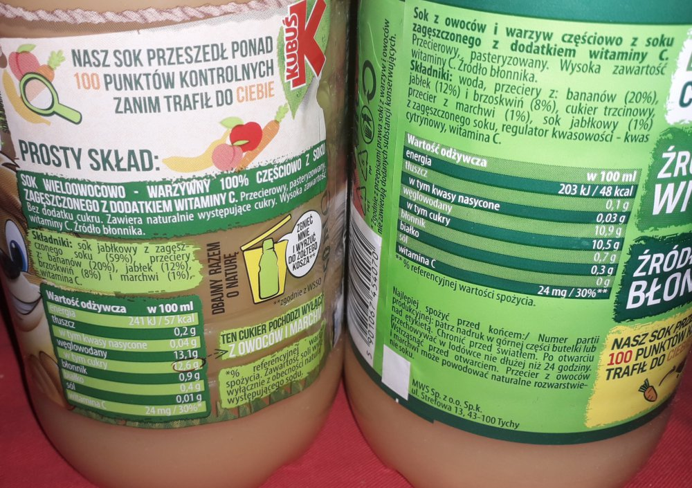 Wcześniej na pierwszym miejscu była woda, a w drugim przypadku nie ma. Sok jabłkowy zagęszczony wcześniej 1% a teraz na pierwszym miejscu i 59%. Niby nie ma dodanego cukru, ale w takim zagęszczonym soku jest go więcej.