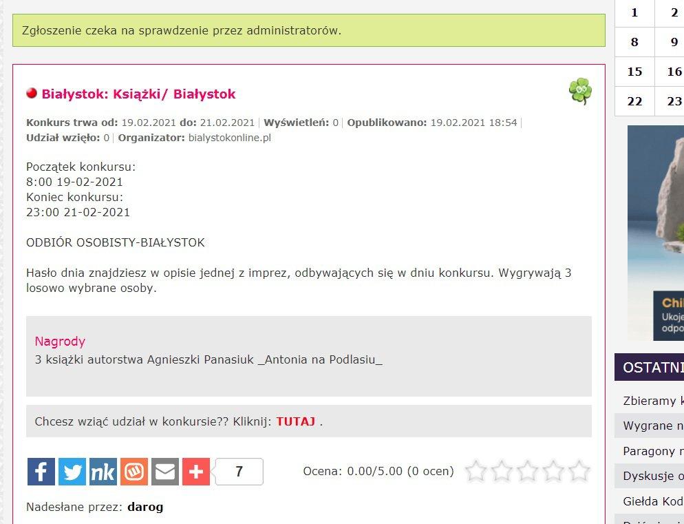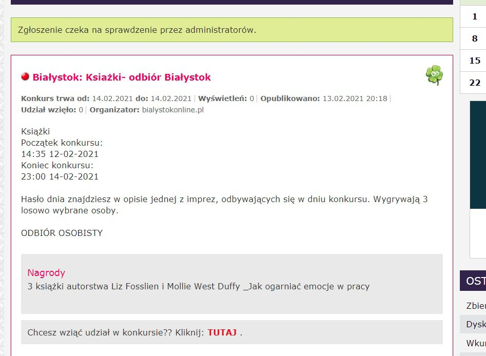 Wyobraź sobie: że wbijam konkursy w kilka minut/ godzin po ich pojawieniu się. To są konkursy lokalne i czasami trwają 1 dzień od 10;00-22;00...A te były na te warunki "długie".