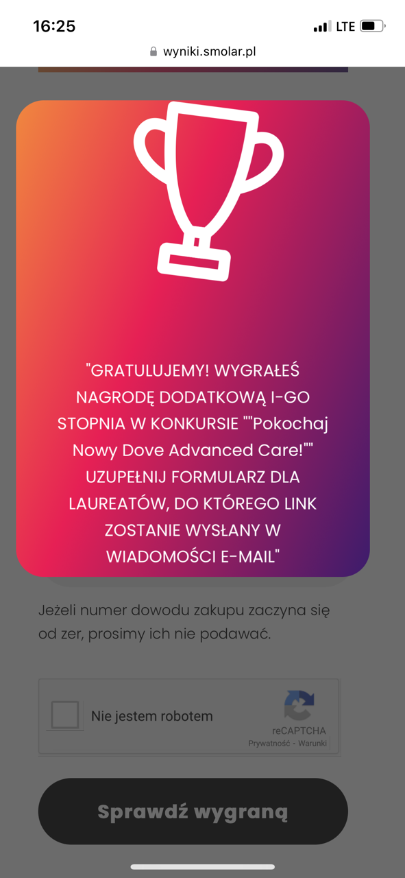 Inna opcja: przy sprawdzaniu w wynikach/laureatach nie podaje się na początku zera w polu numeru paragonu, jeśli zero jest (ale to z pewnością już wiesz).