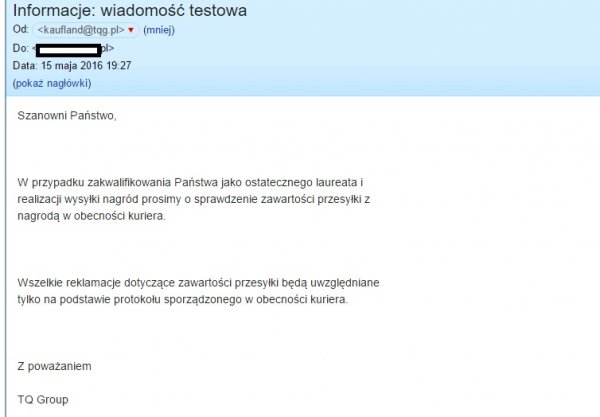 Szanowni Państwo,W przypadku zakwalifikowania Państwa jako ostatecznego laureata i realizacji wysyłki nagród prosimy o sprawdzenie zawartości przesyłki z nagrodą w obecności kuriera.