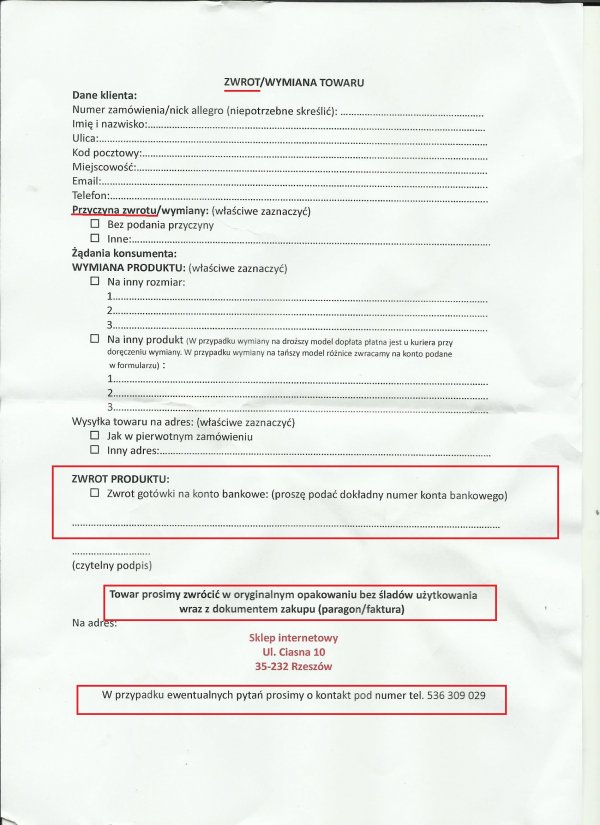 Do zakupów dołączony jest taki formularz zwrotu, może kogoś zainteresuje, na dole jest podany nr telefonu i można się spytać czy w przypadku zapłaty bonem, można otrzymać zwrot gotówki na konto.