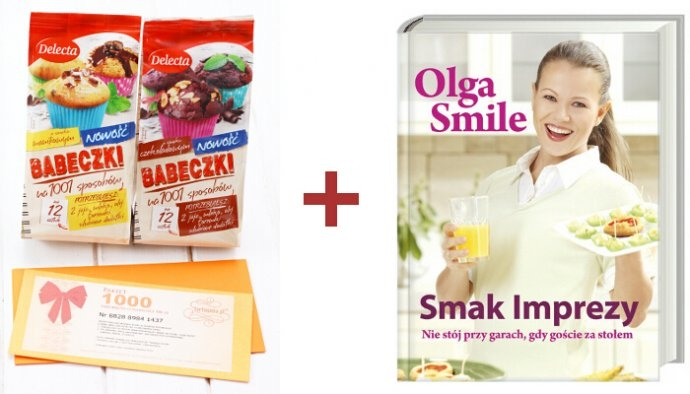 dwa opakowania babeczek na 1001 sposobów, bon o wartości 100 zł na 1000 dekorów w sklepie internetowym tortownia.pl i 3 książki z dedykacją "Smak Imprezy" autorstwa Olgi Smile
