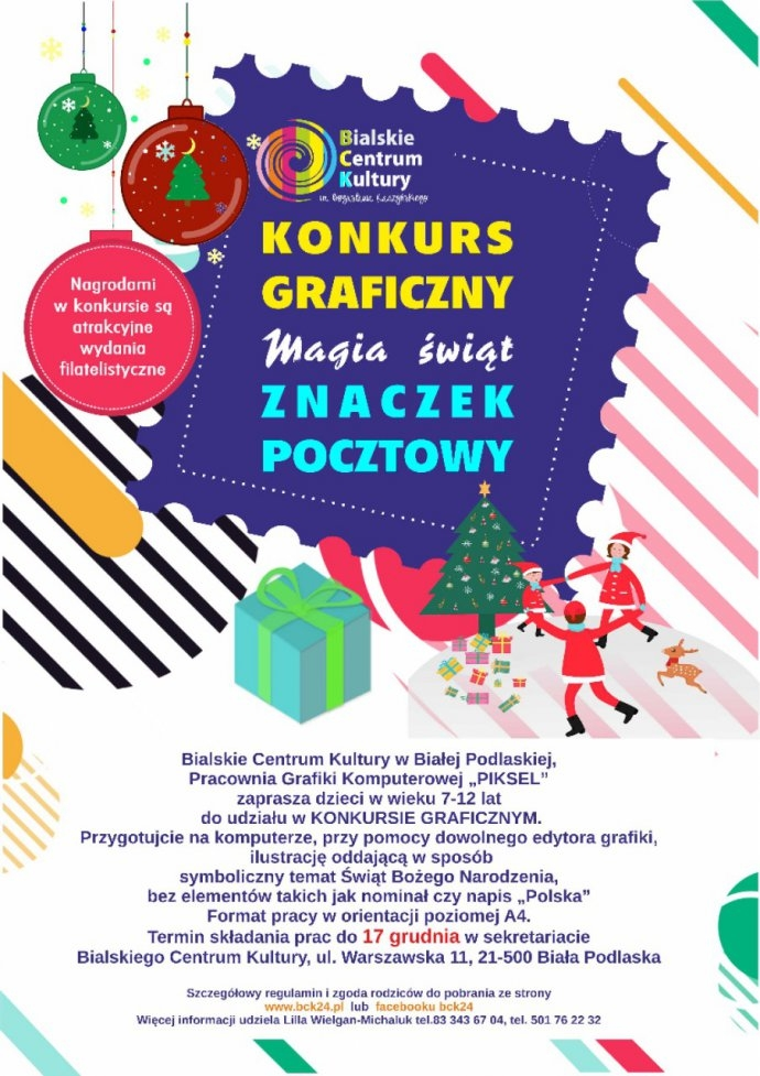 Bialskie Centrum Kultury organizuje Konkurs Graficzny dla dzieci w wieku 7-12 lat na Projekt Znaczka Pocztowego pt. „Magia świąt”. Zadanie polega na stworzeniu przy pomocy komputera, z użyciem dowolnego edytora do grafiki, ilustracji przedstawiającej w symboliczny sposób Święta Bożego Narodzenia.