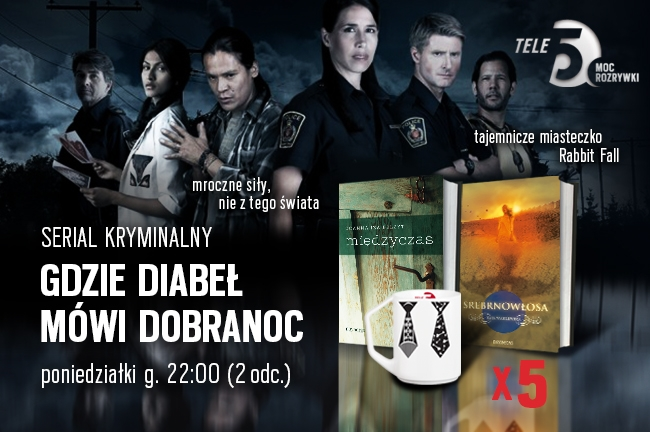 5 zestawów: książka "Międzyczas" i "Srebrnowłosa" oraz kubek Tele5