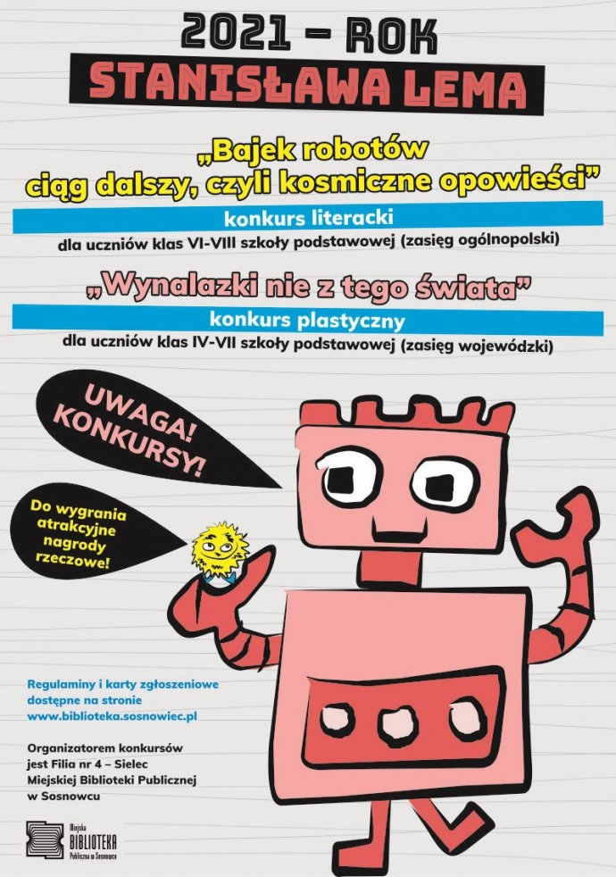 Prace konkursowe należy przesłać do 31.03.2021 r. na adres mailowy: f4@biblioteka.sosnowiec.pl lub pocztą tradycyjną na adres: Miejska Biblioteka Publiczna, Filia nr 4, ul. Zamkowa 9, 41-200 Sosnowiec – dopisek „Konkurs Bajek robotów ciąg dalszy” (decyduje data na stemplu).