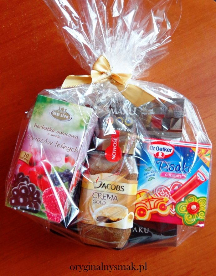 paczka w skład której wchodzą: Przewodnik „Szlakiem dobrego smaku”, kawa rozpuszczalna Jacobs Crema Gold, herbata Earl Grey, herbatka owocowa o smaku owoców leśnych oraz pisaki cukrowe.Dodatkowo nagroda pocieszenia w postaci pisaków cukrowych.