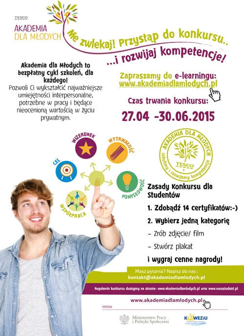 Akademia dla Młodych to inicjatywa społeczna Grupy Tesco, wspierająca naukę młodych ludzi na uczelniach wyższych w Polsce i na świecie. Wyciągając dłoń do świata nauki, chcemy wspólnie realizować kształcenie młodych ludzi, rozwijając kluczowe kompetencje, poszukiwane na rynku pracy.