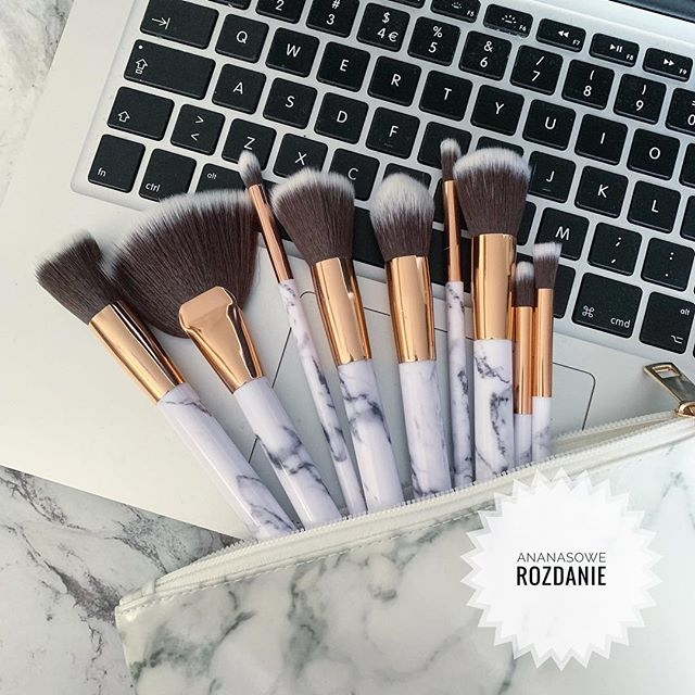 zestaw pięknych pędzli ze zdjęcia i mała marmurkowa kosmetyczka.