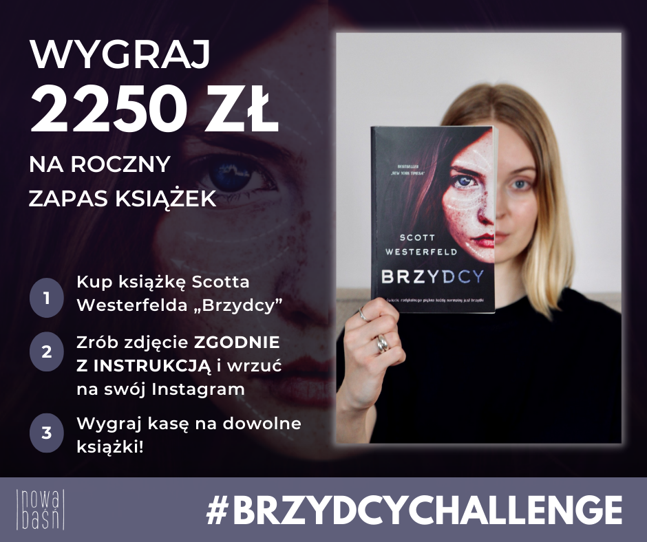 Wystarczy, że zakupisz książkę „Brzydcy” Scotta Westerfelda, prześlesz na nasz adres e-mail (wydawnictwo@nowabasn.com) zdjęcie lub skan paragonu i opublikujesz zdjęcie książki na Instagramie, zakrywając nią połowę swojej twarzy! Koniecznie podpisz swój post, używając hashtagu #BrzydcyChallenge oraz oznacz profil @wydawnictwonowabasn! Szczegółowe informacje znajdziesz w Regulaminie konkursu.