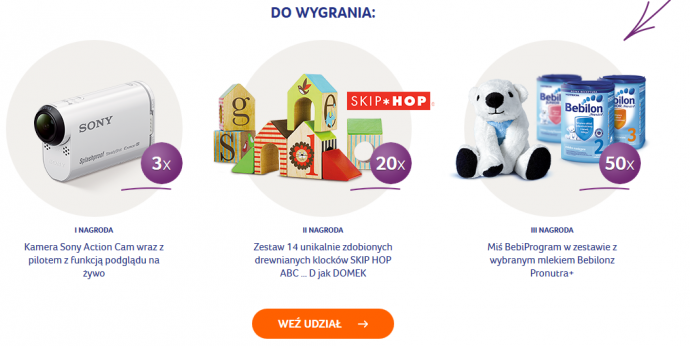 3 kamery Sony, 20 zestawów klocków, 50 sztuk mleka Bebilon oraz maskotki misie
