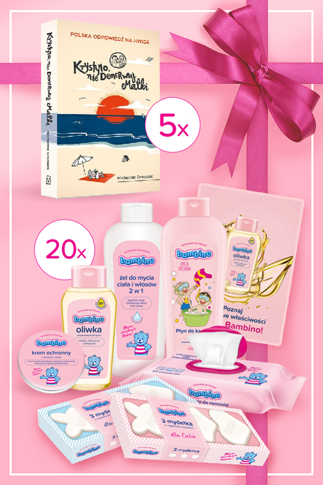 20 (dwadzieścia) zestawów kosmetyków marki Bambino składających się z: Oliwka mała, ulotka masażyki/DYI płyn do kąpieli 400ml z BolkiemiLolkiem, chusteczki z klipsem, mydełka w kształtach, krem ochronny (150), żel 2w1 400 ml, każdy zestaw o łącznej wartości 73,91 zł (siedemdziesiąt trzy złote, dziewięćdziesiąt jeden groszy) brutto („Nagroda I Stopnia”),
