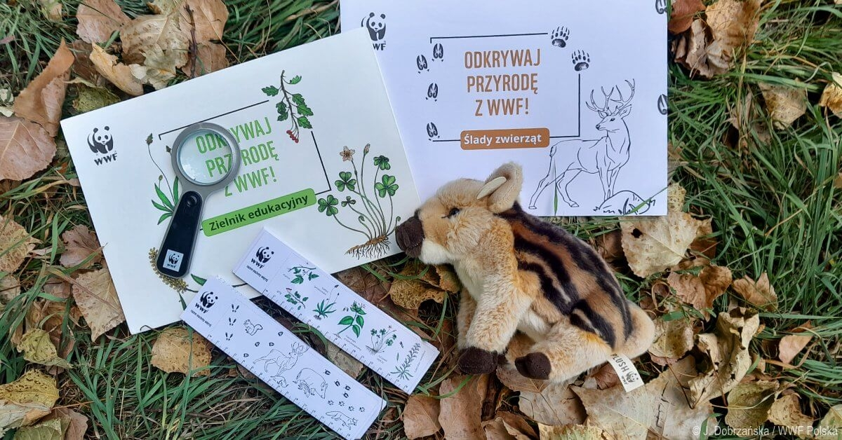 - 3 prace zwycięskie: pluszowy dzik, dwa plakaty prezentujące Dzikie Narzędziowniki WWF: “Zielnik edukacyjny”, “Ślady zwierząt”, 30 lup z logiem WWF, zakładko-linijki z motywem roślinnym i zwierzęcym w liczbie uczestniczących w obserwacji dzieci oraz dwie dla opiekunów/ek,