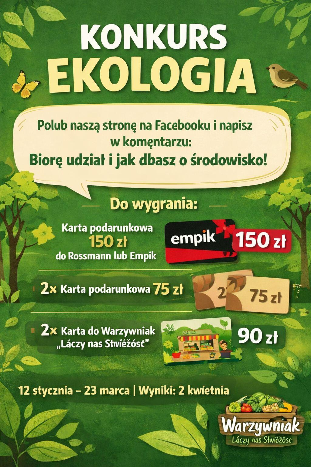 - Dodać komentarz pod postem konkursowym zawierający dopisek „Biorę udział” i krótką wypowiedź związaną z ekologią (np. jak dbasz o środowisko lub dlaczego ekologia jest ważna)
