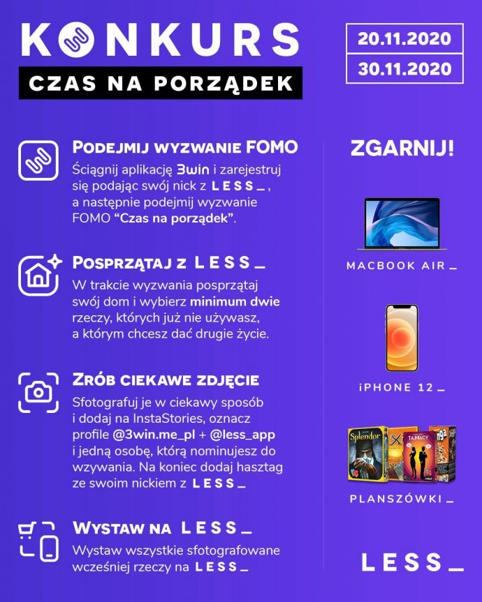 - Sfotografuj je w ciekawy sposób i dodaj na InstaStories, oznacz profile @3win.me_pl + @less_app i jedną osobę, którą nominujesz do wyzwania. Na koniec dodaj hasztag ze swoim nickiem na LESS_