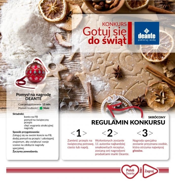 - za pomocą specjalnej aplikacji na profilu Deante w serwisie Facebook zamieścić: nazwę potrawy, czas przygotowania, informację dla ilu osób jest przewidziany przepis, listę składników oraz przepis na świąteczną potrawę z nowoczesną/innowacyjną/zaskakującą nutą. W Konkursie można zgłosić przepis na tradycyjne danie świąteczne w nowej odsłonie oraz na potrawy, przekąski, napoje, drinki, które nie są bezpośrednio kojarzone ze świętami, jednak idealnie pasują do ich charakteru.