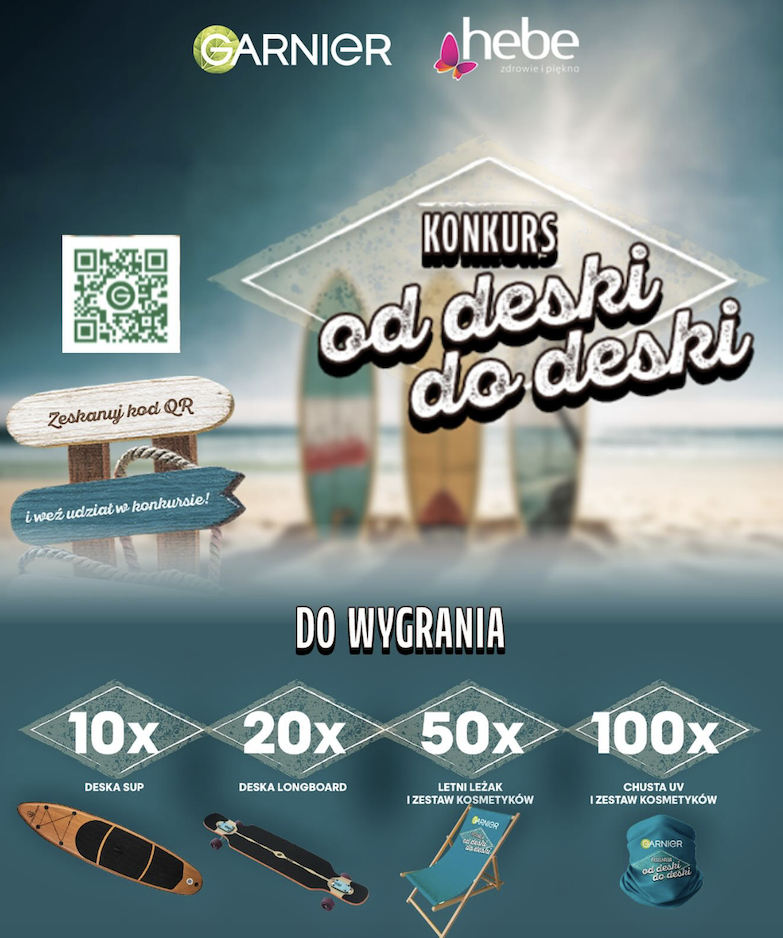 W terminie 19.06 - 21.08.2025 kup minimum 1 dowolny produkt marki Garnier w Hebe (stacjonarnie lub online). Zachowaj paragon. Pokaż swoją zajawkę! Wykonaj zadanie konkursowe: „Moja zajawka na deskę – pokaż na zdjęciu lub opisz słownie”. Puść wodze fantazji! Wyślij zgłoszenie! Wypełnij formularz na stronie konkursowej. Możesz zgłosić się wiele razy – 1 paragon = 1 zgłoszenie!