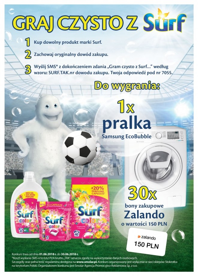 Kup dowolny produkt marki Surf, zachowaj paragon i jak najciekawiej dokończ zdanie "Gram czysto z Surf...". Wyślij SMS pod numer 7055 o treści według wzoru: SURF.TAK.nr dowodu zakupu.Twoje dokończenie zdania.
