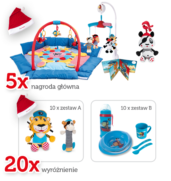 - 5x zestaw zabawek z kolekcji „Piraci”: mata do zabawy, karuzela elektryczna,zabawka z klipsem, książeczka oraz świąteczna czapeczka