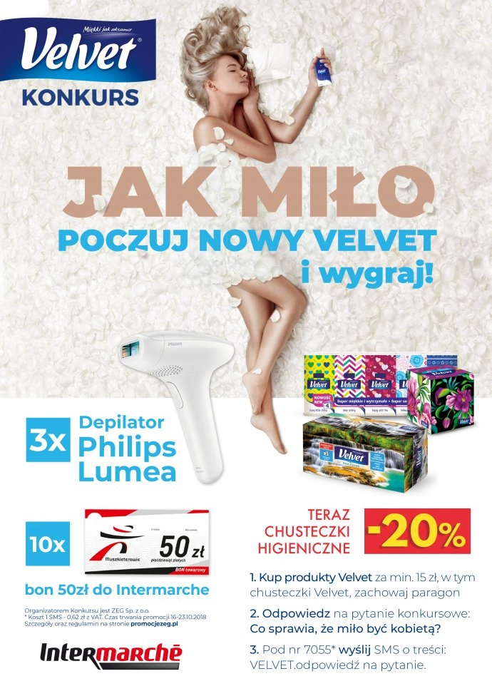 - dokonać zakupu produktów marki Velvet w sklepach sieci Intermarche za minimum 15 zł, przy czym wśród zakupionych produktów muszą się znaleźć chusteczki higieniczne marki Velvet