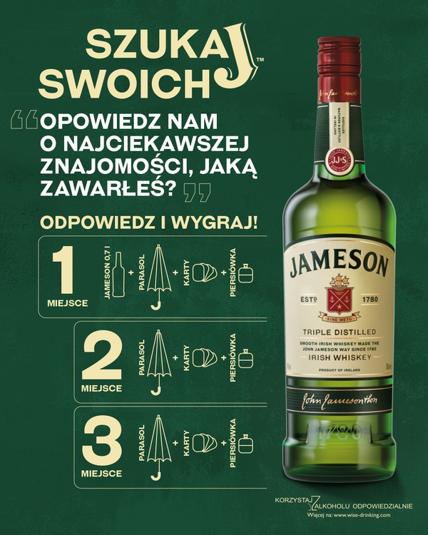 - 1 miejsce: butelka Jameson 0,7L + parasol, karty i piersiówka