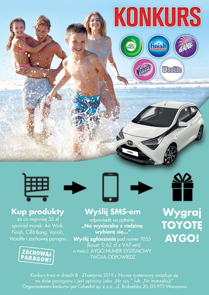 Kup w Kaufland produkt lub produkty następujących marek : Air Wick, Cilit Bang, Finish, Vanish, Woolite za minimum 35zł i zachowaj paragon.Wykonaj zadanie konkursowe-dokończ zdanie"Na wycieczkę z rodziną wybiorę się. .."