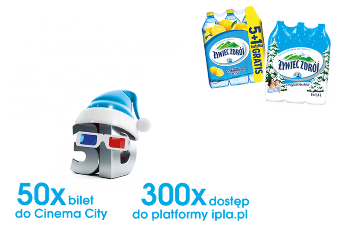 50x dwuosobowe bilety do Cinema City o wartości 62 złotych brutto każdy wraz z nagrodą dodatkową o wartości 7 zł przeznaczoną na zapłacenie podatku.